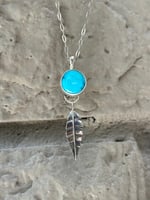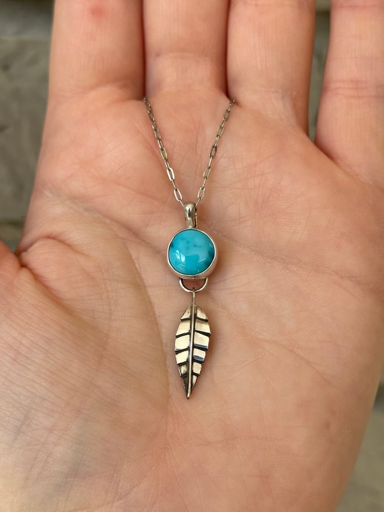 Dainty and beautiful Blue Ridge Turquoise set in a fine silver bezel. Hand forged sterling silver leaf. 18 inch sterling silver chain.